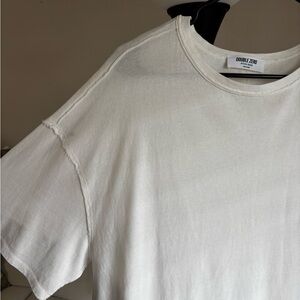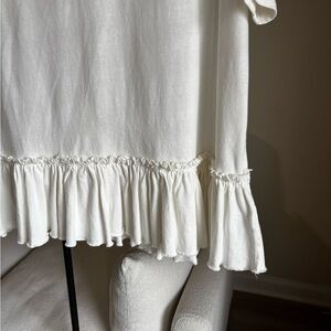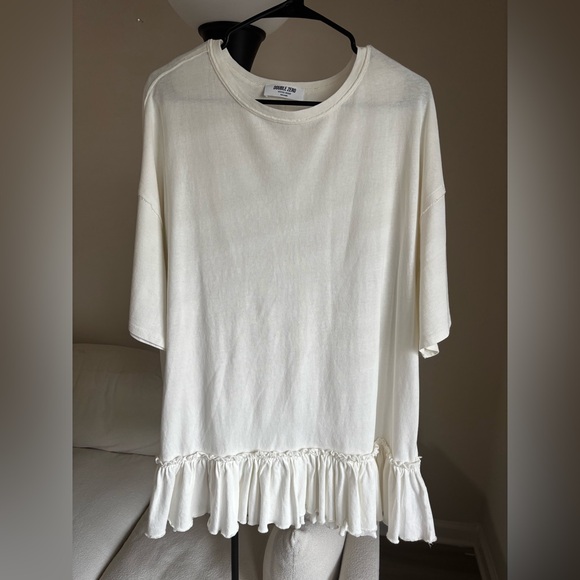Fits like a large. Such cute long top with ruffles along the bottom edge. Really nice material thick but not too thick. Happy to bundle with the other color I have listed.