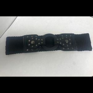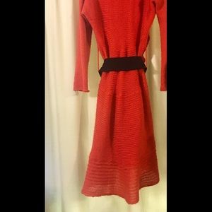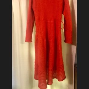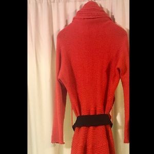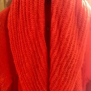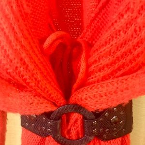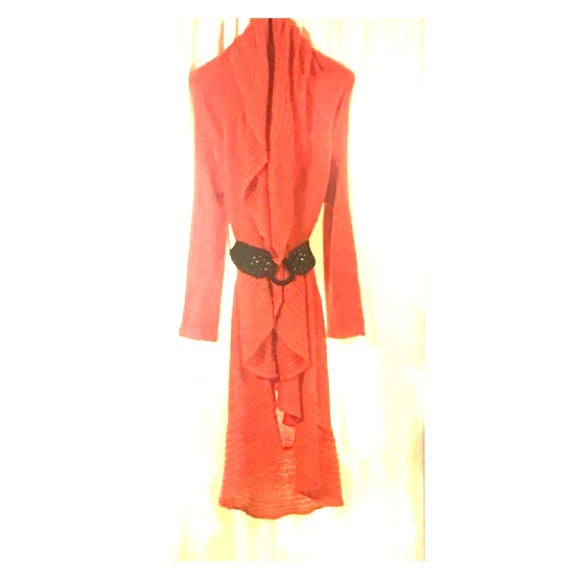 Bright orange soft, fuzzy loose knit cardigan with frayed cuffs and hems and flounce hem across back. The front is open with cascade ruffles down front but has 2 internal ties to keep in place. It comes with a versatile black studded stretch large belt with snap closure at buckle. Worn only twice briefly, no signs of ware. Great way to dress up jeans! Looks great with everything especially boots!