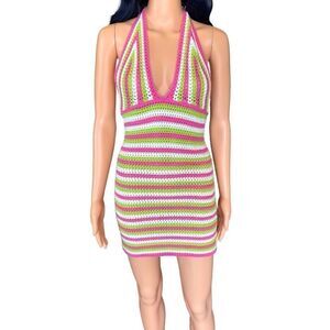 Double Zero Pink Colorful Crochet Halter Mini Dress Size Small Medium Festival