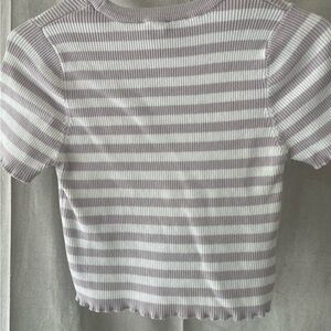 Stylish ribbed crop top. Features purple and white stripes. Short sleeves and round neckline. Perfect for casual wear.