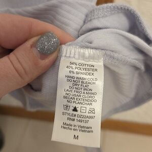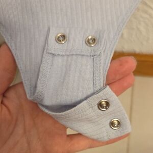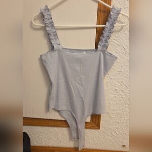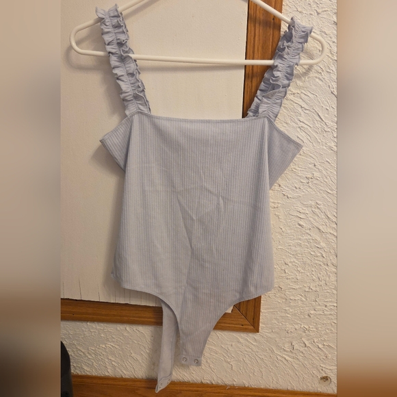 Very cute body suit with ruffled straps. Pretty baby blue/baby indigo color. A very light blue-purple.