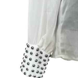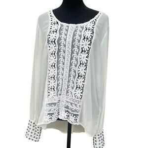 DOUBLE ZERO women’s size M blouse. Ivory colored with lace, sheer with long sleeves and wide cuffs that are adorned with silver metal rounded studs. Hidden snap closure on the cuffs. The back has snaps from the neck to the hem. The back is longer than front.
