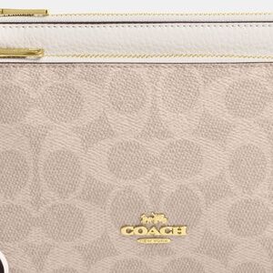 Signature coated canvas and refined pebble leather Eight credit card slots Double zip closure fabric lining Wrist strap attached 8 (L) x 4 3/4 (H) x 1 (W) Fits all phone sizes up to an iPhone X and Samsung S7 Edge Style No. CX161