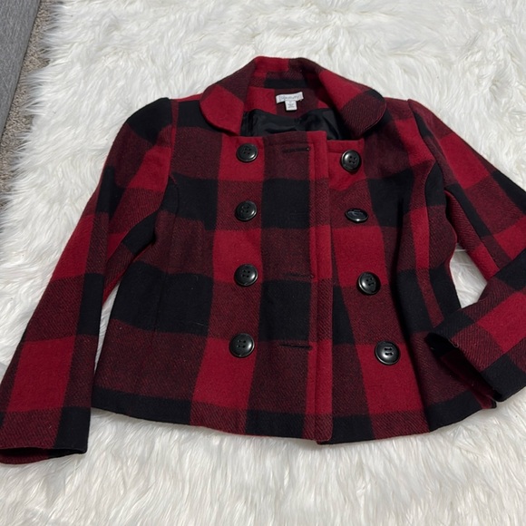 Red and black, waist length plaid pea coat