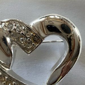 Enjoy this silver alloy metal double heart brooch. Clear crystal rhinestones. Functional secure closure. Note blemishes, please review all pictures and video. Offers are welcome.