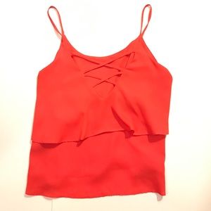 Worn maybe once! Basically new. In SUPER great condition with no stains, scents or tears!! Very cute and light material. Love the open knit upper back. Sort of a silky material (100% Polyester). Double layer and is a size medium but length is more like a small.