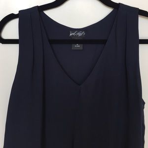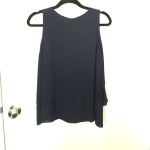 2 layers of silk double georgette. Pleat detail at shoulder. Front and back slit on top layer. Top layer is shorter. Navy Blue. Never worn