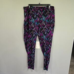 Stylish leggings with a vibrant pattern. Features shades of purple, blue, and black.