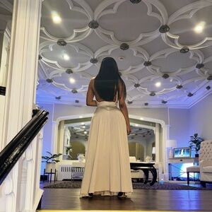 This dress is everything. It has two thigh high slits. It sexy and elegant at the same times. It’s long and flowy. Very lightweight. Great condition
