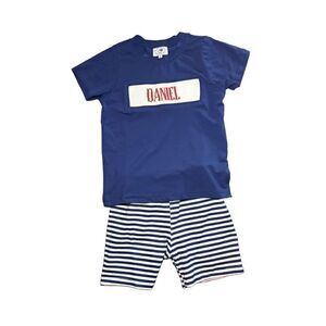 Your little trendsetter will be ready for any adventure with this adorable and versatile Laya & Linc Smocked "Daniel" Outfit Set! Crafted from soft and comfy fabric, this size 6 set features reversible shorts with classic blue stripes on one side and a pop of red stripes on the other, paired with perfectly coordinated smocked blue t-shirt top. Both pieces are brand new with tags, ensuring they're ready to bring a smile to your little one's face.