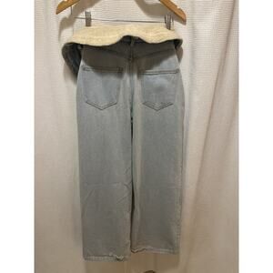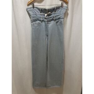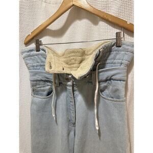 Light wash baggy denim with a double waist design, that allows 2 ways to wear this piece. Lace ties at top waist, belt buckle loops at bottom waist.