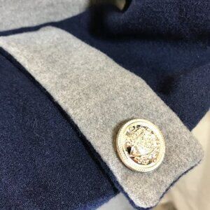 In a world where style meets warmth, this chic double-breasted coat whispers tales of elegance and comfort. With its striking faux fur-lined hood, it envelops you in cozy luxury. The gentle contrast of navy and gray hues dances gracefully, while ornate buttons add a touch of timeless sophistication.