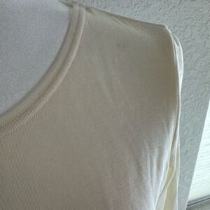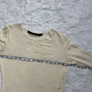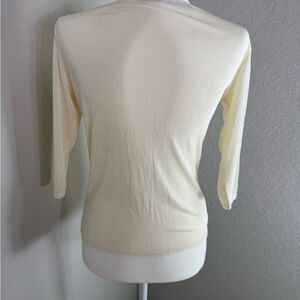 Chic cream blouse with three-quarter sleeves. Soft and versatile. In great cost ion. Can possible fit a small