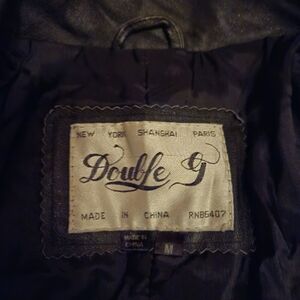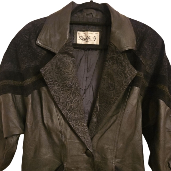 DoubleG Black Leather Jacket, Classic Lapel & Structured Design, Vintage, Sz Med