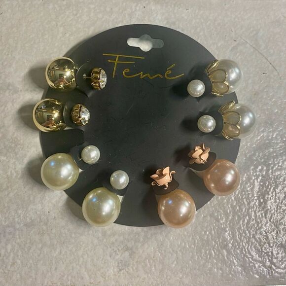 Feme double stud reversible earring set. Faux pearl, gold tone ball, pink faux pearls, rhinestone, pink flowers.