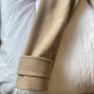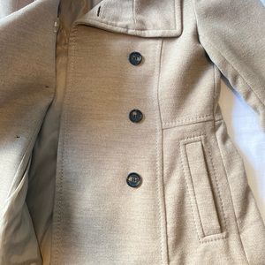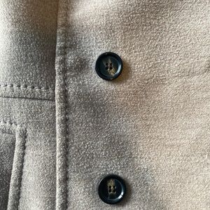 Fitted, double-breasted jacket in felted fabric with a high, stand-up collar. Has decorative stitching on the front and back, side pockets, and a decorative tab at cuffs. Lined.