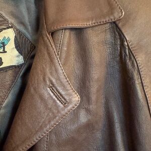 A vintage double-breasted brown leather jacket in like-new condition. My mother got it years ago and I don’t think she ever wore it. It has two front pockets and an interior zippered breast pocket. No size marked, but it fits a ladies large. It has a leather belt at the waist. The sleeves are 16” from the underarm seam to the cuff, and the length is about 30” from the back collar to hem. You can see the interior marker’s label is upside down, and there’s no arterials or care label inside. From a smoke-free home.