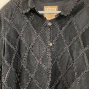 Lightweight perfect for the fall or spring. Has the front button closure. It is knitted and has the leather patches. All black. No flaws. Size large.