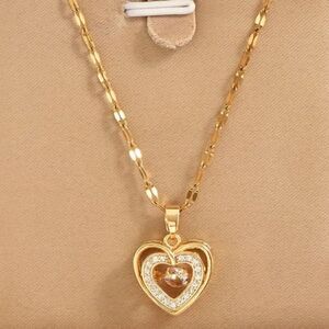 Double-layer three-dimensional gold stainless steel necklace, rhinestone love heart pendant necklace.