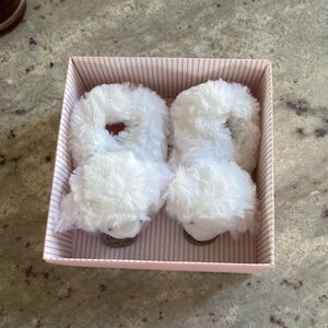 Charming white and pink lamb plush slippers by Doudou et Compagnie Paris. Perfect for keeping little feet warm and cozy.