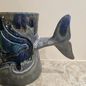 Doug Wylie Pottery Whale Mug w / Tail Handle Drip Glaze Addt'l Whale Tail Inside