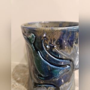 Doug Wylie Pottery Whale Mug w / Tail Handle Drip Glaze Addt'l Whale Tail Inside. Rich blue/green colors. Sea foam bubbles on the front and on the whale handle. No cracks, chips, or crazing. Fun piece. See photos for details. *No trades.