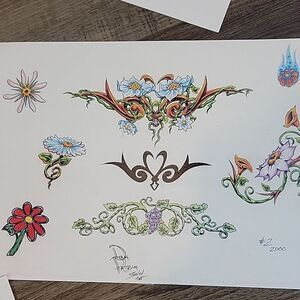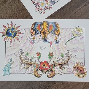 High-quality frame able flash tatoo art signed by Doug Patrum. Most of them date from the early 2000. Great pre-owned condition, but these did hang in a studio at one time. They all seem to have a small tape mark on the bottom.