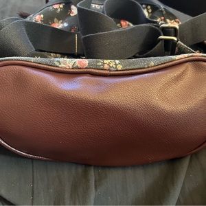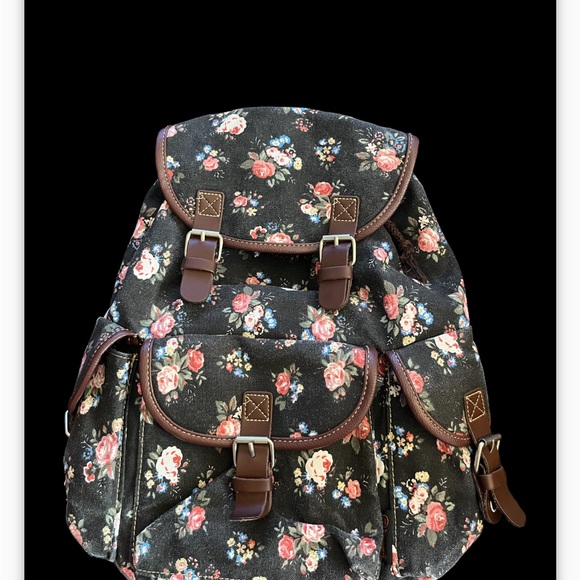 Preowned black red white brown buckle accent snap drawstring closure side pockets leather bottom adjustable straps travel backpack