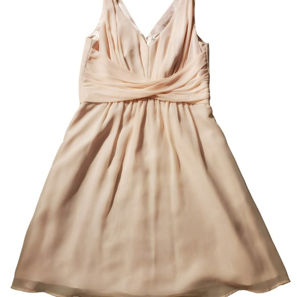 Dove & Dahlia “Julia” Chiffon Formal Bridesmaid Dress.Pink Color. V Neck. Sleeveless. Twist Detail. A-line with Pockets. Fully Lined. Back Zipper.