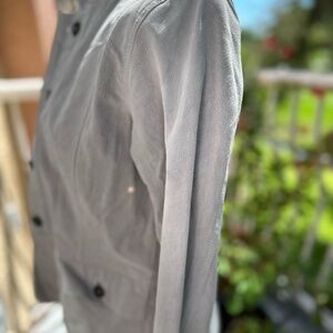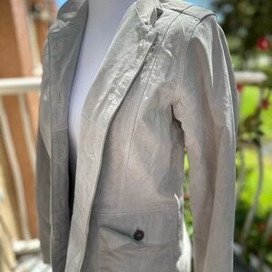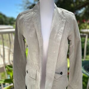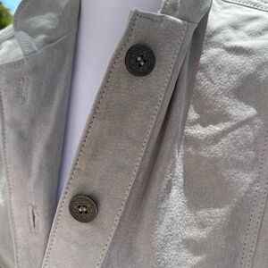 Suede is in this fall and this dove gray jacket is perfect for this fall and next spring! With a mandarin color and cool buttons, this jacket can be worn both opened and closed. Please note - the body of this jacket is stiff and is a bit wrinkled from being in the closet. Never worn. Tags attached, nonsmoking home. Size 0 but Chico's runs big and this fits like a street size 4.
