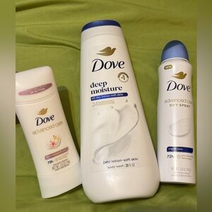 Dove skincare set including body wash, deodorant stick, and dry spray. Another great bundle! 🥰