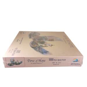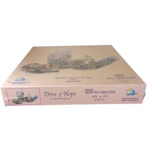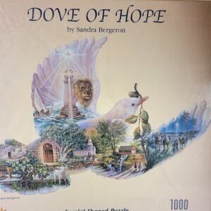 SunsOut “Dove of Hope” jigsaw puzzle by artist Sandra Bergeron. Released in 2001, this special shaped puzzle includes 1000 pieces and measures approx. 40" x 24" when completed. Inspirational Christian-themed artwork includes a dove with olive branch, lion, lamb, church, and cross. Hard-to-find collectible puzzle.