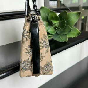 Dover made these purses in the USA, often with needlepoint or tapestry designs. The bags frequently have a classic, elegant look and are sought after by collectors of vintage accessories. This purse has a hinge top open and has black fabric inside with a long zipper pocket, dividing the handbag into two sections. The inside is clean and spacious and a beautiful classic that has a beautiful black detail along the ends on top of the hinge top no holes or scuffs. Clean and non-smoking.