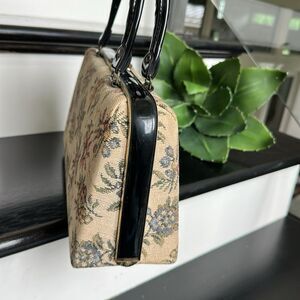 This vintage tapestry handbag with a floral pattern, from the Dover brand. These bags, often referred to as carpet bags, were popular in the mid-20th century. This specific style features a structured shape with a clasp closure and a black handle.