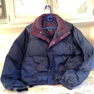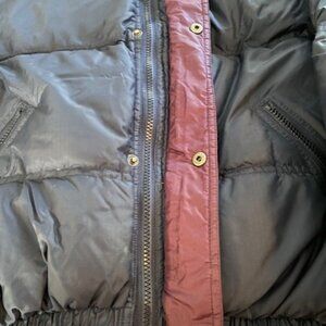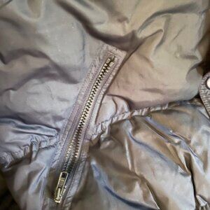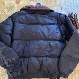 Snow and Ski Down filled puffer jacket. Zips and snaps up the front, two zipper outside pockets and one inside pocket. Small stain on the inside lining in the back. No other damage and from smoke free home.