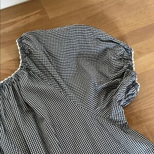 Elegant checkered blouse with puff sleeves. Button-down front. Perfect for any occasion.