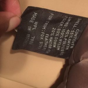 It has a fox fur trimmed removable hood with a drawstring. There is a zipper and snap buttons over it that go to the end of the jacket. There are two pockets. The mannequin is 5'9". It was worn for 1-2 hours and the plastic tag wire is still attached. It shimmers when light reflects off of it. The 4th picture shows the shimmer above the hand but it's visible better in person. The inside is quilted. Bundle to save 20% off. Smoke and pet free house.