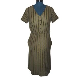DownEast striped dress XS has short sleeves and a V-neckline. Features front buttons and flattering seams. The fabric is a camo green and black striped knit. Falls below knee. Doesn't wrinkle. Great condition!