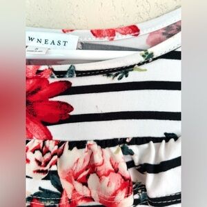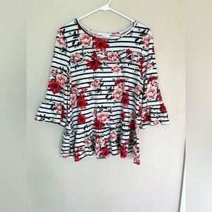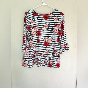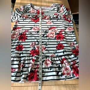 Pre-Loved/Downeast Brand/Black & White Striped Blouse/Floral/Size Small/Good Condition/Light Signs of Wear/Light Thread Pulling/Light Spot/Approximate Measurements Pictured/Refer to Pictures/Buyer Purchases As Is/Make An Offer/Please Ask All Questions Before Purchase