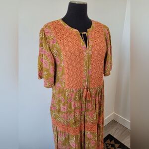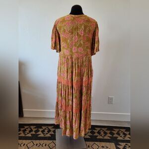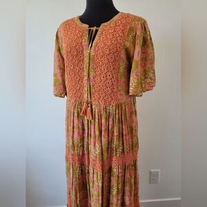 Absolutely stunning maxi length dress. Flutter sleeves with a V neckline and tassels. There is pockets, and a long Tiered skirt with lace panels and it is fully lined. Colors are a chartreuse green and salmon pink, in a floral print. Excellent high quality, in new condition. 100% viscose. Size large measures approximately 50 inches long 19 inches underarm to underarm laid flat 19 inches laid flat across the waist.