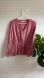 This blouse is made from 100% rayon (feels a bit like linen) in a rosy pink with small white stripes. It has a v-neckline and gathered sleeves. There are 4 buttons down the front and a ruched waistband that creates a sweet, flowy peplum. This top is lined.