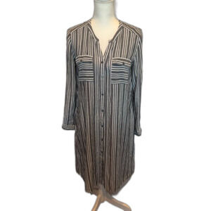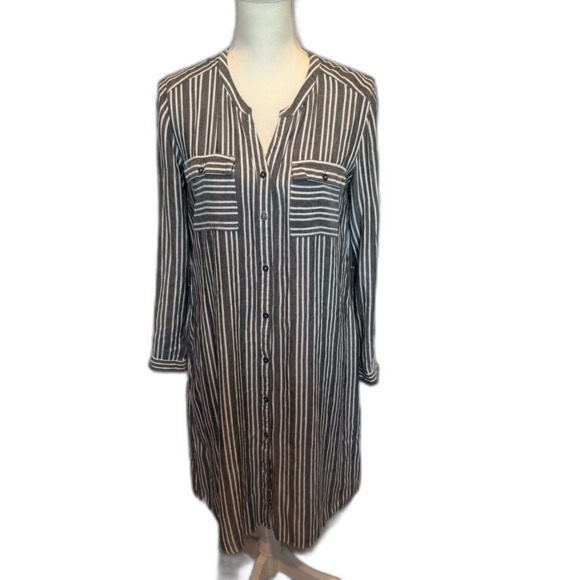 Downeast Shirt Dress Medium Button Front Charcoal White Stripe Pockets