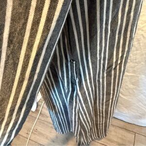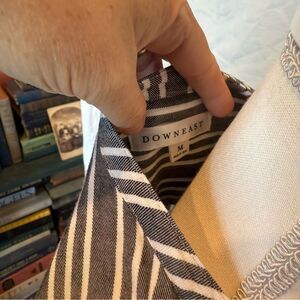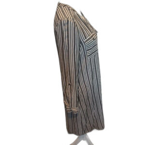 Downeast button front shirt dress, charcoal grey and white striped, front breast pockets, side pockets. Size medium. 100 percent rayon, dry clean or machine care. Flowy, polished summer dress. Missing self belt. Very good preowned condition. Best for someone without muscular biceps- lay flat measurement of bicep area is approxiamtely 5".