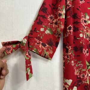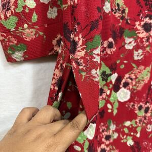 TAGS: Evening, Gown, Dress, Tied, Red, Floral, Pockets, Event, Party, Sheath, Midi, 3/4, Sleeve, Small, Downeast, Designer, Pretty, Femme, Feminine