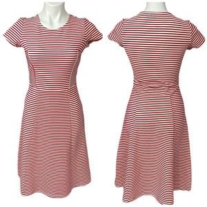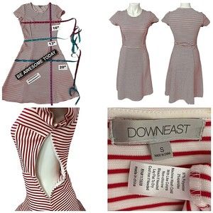 Dress By: Downeast / Pullover with Side Zip Closure / Red & White Striped / Fit and Flare A Line Style / Sturdy Fabric made of Polyester - Spandex / Set In Short Sleeve / Round Neckline.