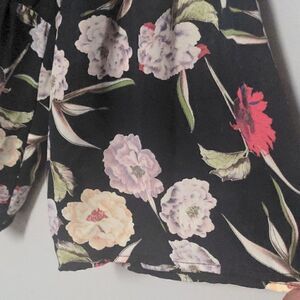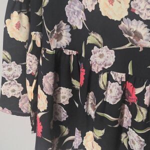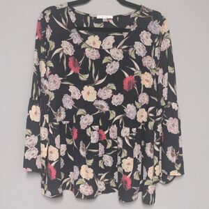 Navy peplum blouse with bell sleeves. white, pink and green floral print excellent preloved condition measurements 21" pit to pit, 26" long