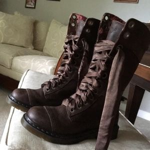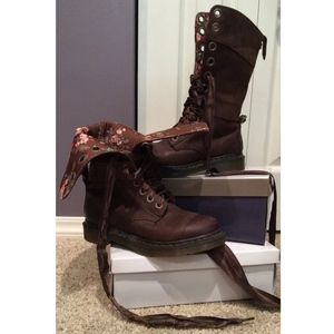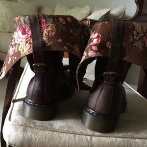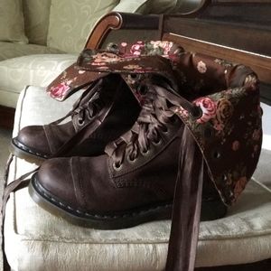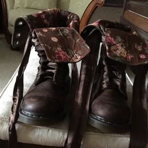 Boots are in excellent condition and have only been worn once. Can be folded down to reveal floral inner panel, or laced up to flaunt the silky ribbon laces. Alternate second pair of thinner solid brown laces (not pictured but will upon request) come with boots, as they accompanied boots when I initially purchased them.