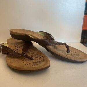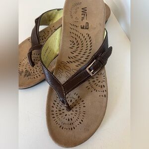 These Dr. Andrew Weil Restore Sandals are women's size 10 in a brown color. They are designed as flip flop style sandals with a leather upper and a rubber outsole, making them suitable for casual occasions. The sandals have a European size of 41 and are not vintage.