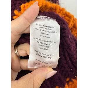 Statement-making and cozy, this Dr. Bloom Barcelona limited edition sweater is a bold piece for lovers of artisanal knitwear and playful colorblocking. Handcrafted in Italy from a warm wool-acrylic blend, it features a rich burgundy chunky knit body accented with sky blue sleeves and a bright orange hem trim for a pop of contrast. The open-stitch detailing at the shoulders and oversized ribbed neckline give it that modern, slouchy silhouette that’s both effortless and eye-catching.