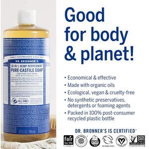 Dr. Bronner’s Peppermint Liquid Soap is scented with organic peppermint essential oil for a refreshing, clean feel that leaves skin feeling cool and awakens the senses. Made with a nourishing blend of Regenerative Organic Certified oils, this true soap creates a rich, smooth lather that rinses clean—leaving skin feeling fresh and renewed. Great for everyday use, it’s crafted with ethically sourced, organic ingredients and contains no detergents, dyes, or added foaming agents. Vegan, made with Organic Oils, Fair Trade, and EWG Verified for peace of mind—because caring for your body should also care for the planet!